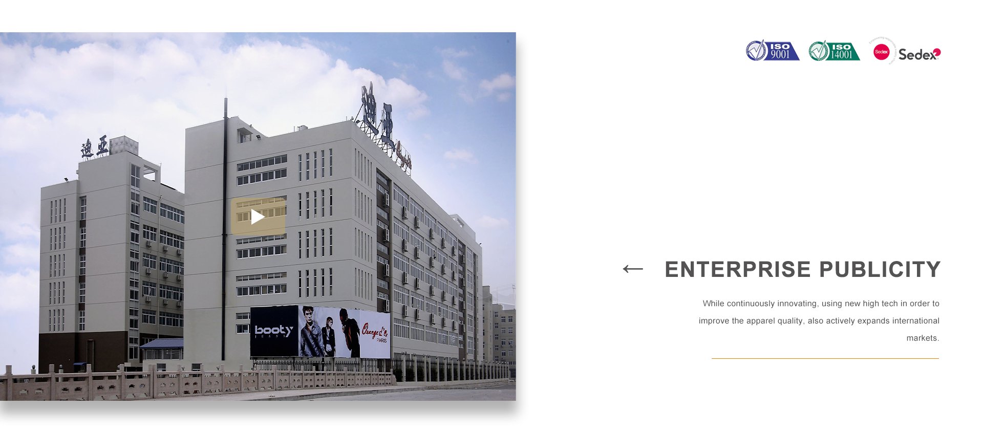 浙江迪亞服飾有限公司于1998年在世界時尚品牌之都——法國巴黎二區應運而生。同年,在浙江省甌海經濟開發(fā)區東方南路28號設立服裝制造工廠。公司集服裝設計、生產、營銷、品牌于一體,在不斷創(chuàng)新、采用高新技術提高服飾質量的同時,積極拓展國際市場,海外營銷部長期與LV集團旗下的MAJE、SOEUR、BALIBARIS等國際著名品牌保持非常緊密的合作關系。